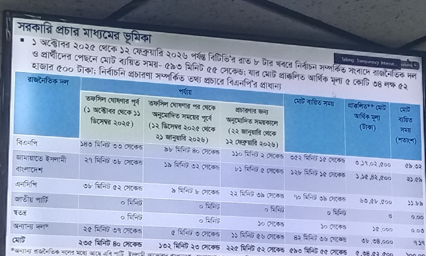 প্রতিবেদন থেকে আরও জানা যায়, নির্বাচনি প্রচারে সময় দিয়ে বিএনপির পেছনে বিটিভির ব্যয়িত সময়ের মূল্য ৩ কোটি ১৭ লাখ ২৫০০ টাকা। আর জামায়াতের পেছনে ব্যয়িত সময়ের মূল্য ১ কোটি ১৫ লাখ ৪২ হাজার ৫০০ টাকা। এ ছাড়া মোট ৫৯৩ মিনিট ৫৫ সেকেন্ড ব্যয়িত সময়ের মূল্য ৫ কোটি ৩৪ লাখ ৫২ হাজার ৫০০ টাকা।