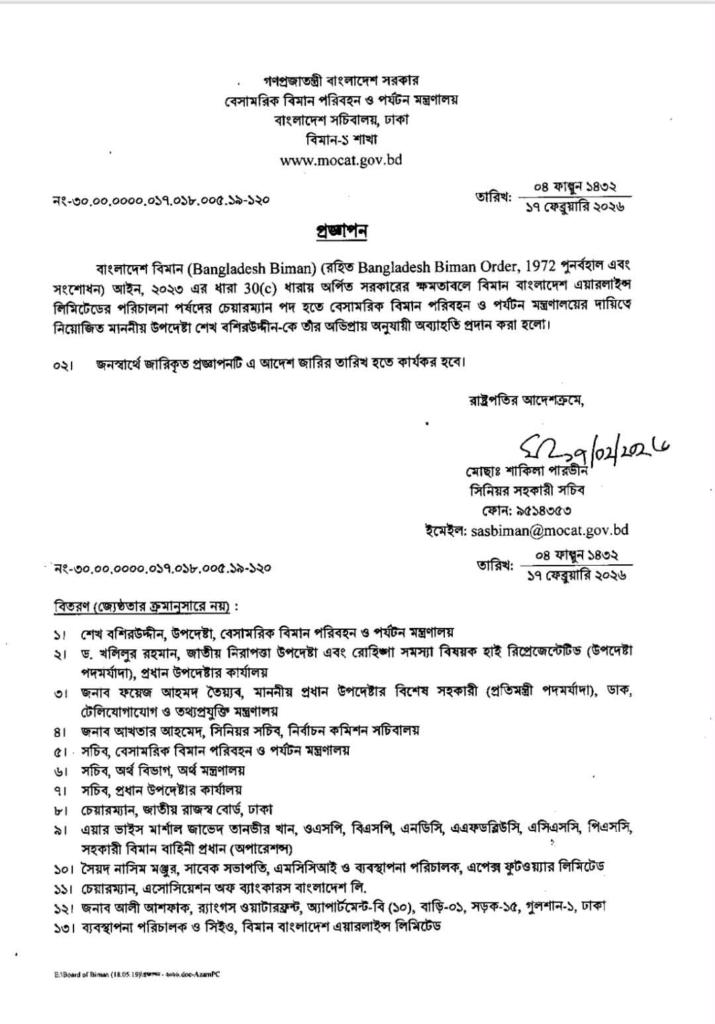 মঙ্গলবার (১৭ ফেব্রুয়ারি) রাষ্ট্রপতির আদেশক্রমে বেসামরিক বিমান পরিবহন ও পর্যটন মন্ত্রণালয় থেকে এ-সংক্রান্ত প্রজ্ঞাপন জারি করে। প্রজ্ঞাপনে স্বাক্ষর করেন মন্ত্রণালয়ের সিনিয়র সহকারী সচিব মোছা. শাকিলা পারভীন।