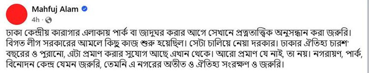 মাহফুজ তার পোস্টে লিখেছেন, ঢাকা কেন্দ্রীয় কারাগার এলাকায় পার্ক বা জাদুঘর করার আগে সেখানে প্রত্নতাত্ত্বিক অনুসন্ধান জরুরি।